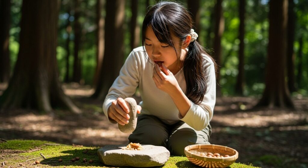 なんと、どんぐりを石で割り、ナッツ感覚で食べていたそうです。