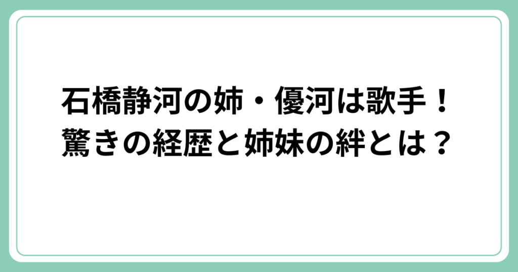 芸能界で活躍する石橋静河さん。 その姉も実は音楽界で注目を集めているのをご存知でしょうか? 今回は、石橋静河さんの姉・優河さんについて、その経歴や音楽活動、そして姉妹の絆に迫ります。 芸能一家に生まれた二人の才能あふれる姉妹の物語をお楽しみ... -