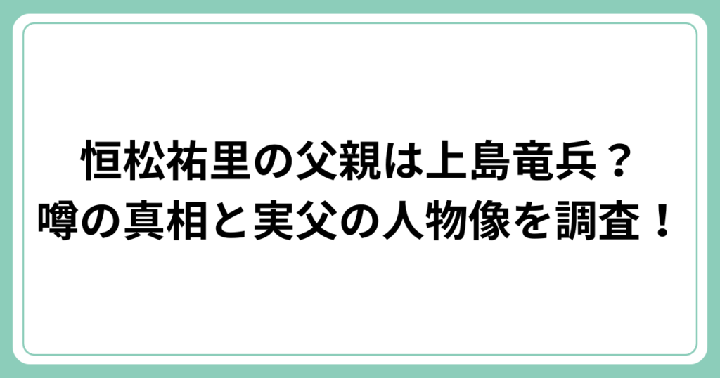 女優として活躍する恒松祐里さんですが、「父親は上島竜兵さん?」という噂を耳にしたことはありませんか? ネット上では恒松祐里さんの父親について様々な憶測が飛び交っています。 この記事では、恒松祐里さんの父親に関する噂の真相と、実際の父親の人... -