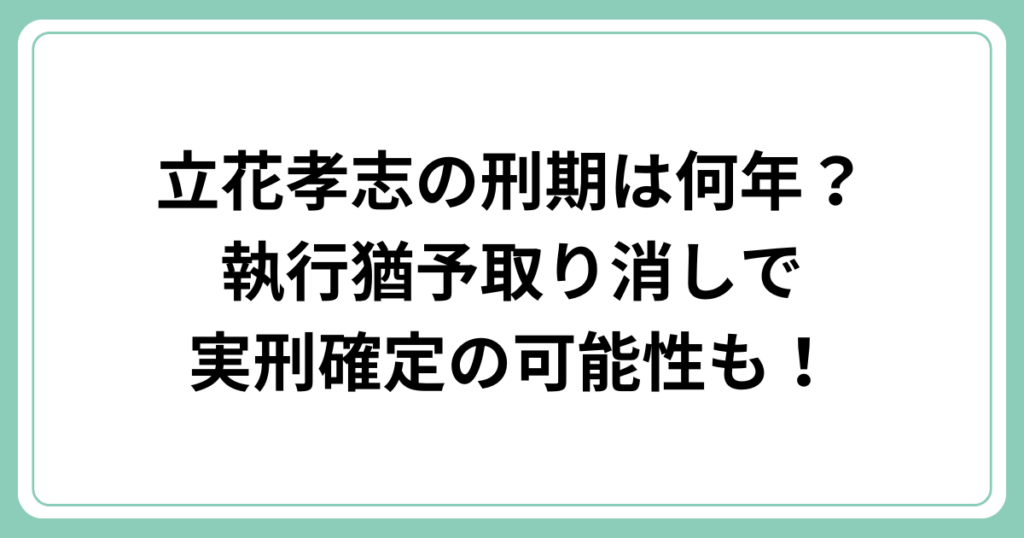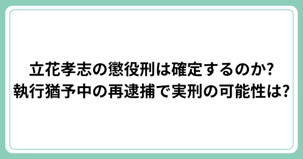 元NHK党党首の立花孝志氏が2025年11月に名誉毀損容疑で逮捕されました。 立花孝志氏は現在執行猶予中の身であり、今回の逮捕で実刑になる可能性が高まっています。 この記事では、立花孝志氏の刑期や執行猶予取り消しの可能性について詳しく解説します。 ... -